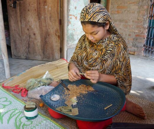 Genç kızlar, erken çocukluk dönemlerinde evlerinde tütün tozuna maruz kalmaları ve annelerine günün hedefini tutturmaları için yardım etmeleri nedeniyle büyük risk altında. Tanuja, Majhpara Mahallesi’nde daha 10 yaşına gelmemiş küçük bir çocuk olarak bu işe başlamış. “Anneme uçlarını katlamada ve tütünleri bağlamada yardım ederdim” diye anlatıyor ve ekliyor: “Toplumumuzda ‘Tütün sarmasını bilmeyen kızlara koca bulunmaz’ derler.”