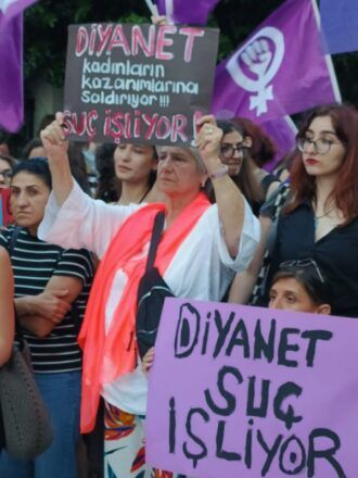 “Diyanet, kadınların görünmeyen emeğini yok sayıyor, erkeklere mallarımızı gasp etmeleri için çağrı yapıyor. Ne emeğimizin ne de eşit miras hakkımızın gaspına izin veririz. Kadın düşmanlığını camilerden perçinleyen hutbelere karşı sokaktayız. Kazanılmış haklarımızı tartıştırmayacağız.”