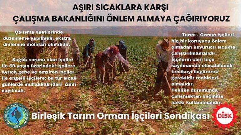 Sevda Karataş, Umut Sendikası’nın Avukatı(Umut-Sen) sıcaklık arttıkça işçilerin yaşamla ölüm arasında çalıştıklarını vurguluyor. Bu sebeplerle birçok iş cinayetinin de yaşandığına dikkat çekiyor ve şöyle sürdürüyor konuşmasını; “Özellikle kadın işçilerin çalıştığı atölye, tekstil fabrikası gibi yerlerde klimalar ya yetersiz ya da bulunmuyor. Ya da açık alanda çalışan tarım işçilerinin çalışma saatleri düzenlenmiyor. Veya talep edilen izin verilmiyor. Bu açıkça işçilerin canının, sağlığının maliyet hesabına kurban edildiğini gösteriyor. Ve kabul edilebilir bir durum değil. Kadın işçiler bu koşullardan daha fazla etkilenebiliyor. Regl döneminde, hamilelikte ya da menopoz sürecinde sıcak çok daha yıkıcı olabiliyor. Baygınlık, nefes almakta zorlanma, tansiyon, beyin kanaması, kalp krizi gibi birçok riske rağmen üretim bir şekilde devam ediyor”.