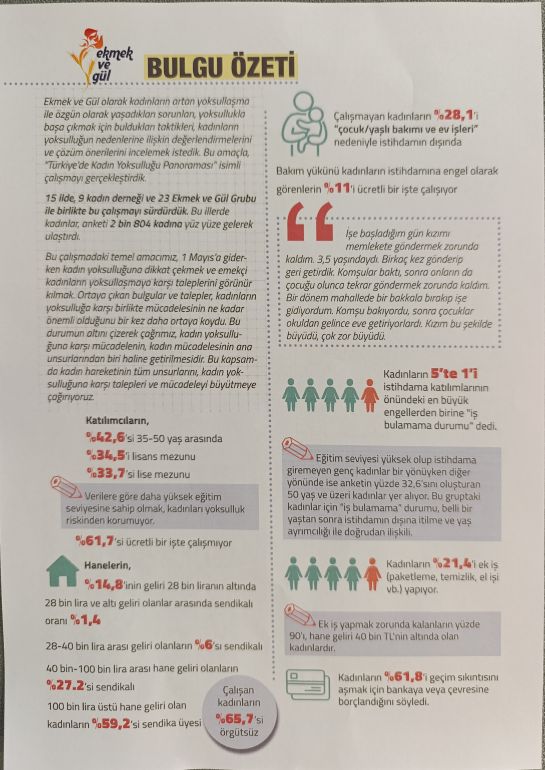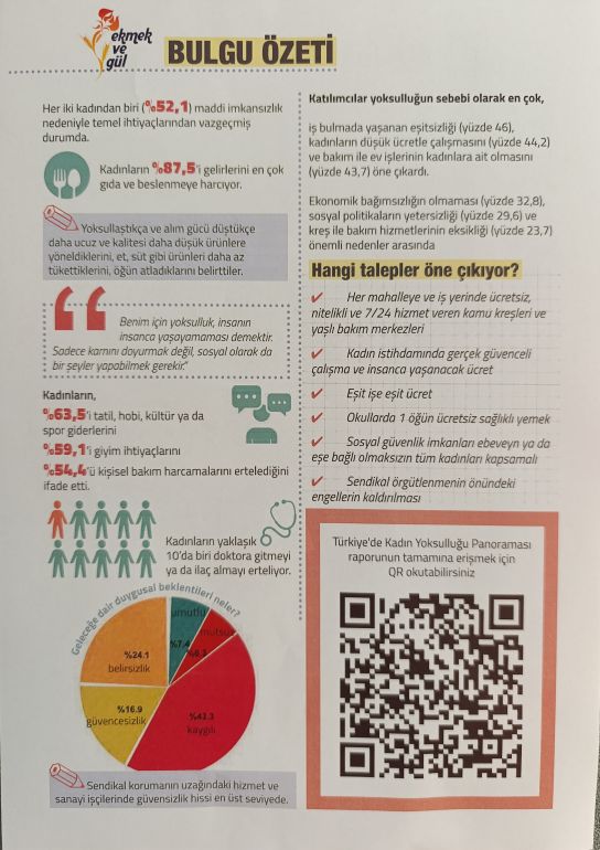 Ekmek ve Gül, 15 ilde 2 bin 804 kadınla yoksulluğu araştırdı. Kadınlar sadece yoksul değil, aynı zamanda güvencesiz, borçlu ve bakım yükü altında eziliyor. Her iki kadından biri temel ihtiyaçlarından vazgeçiyor. İşi olan kadınlar da borçla ve ek işle hayatta kalmaya çalışıyor.