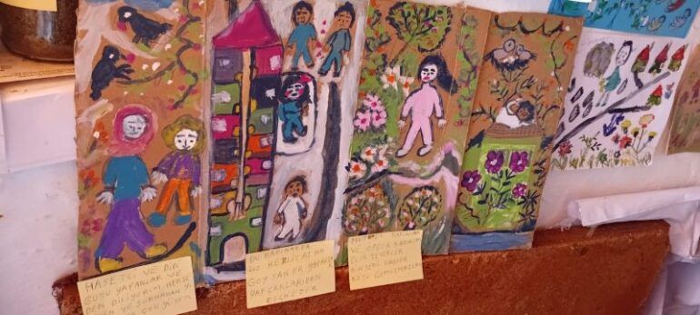 Resim malzemelerini İstanbullular dediği, dışardan köye gelip yerleşen şehirli yeni dostları getiriyormuş zaman zaman. Paşaköy’de yaşayan biri “Kağıda değil, kartona resim yap” deyip kartonlar getirmiş Hakime’ye… Sonuçta, evinin bir bölümünü resimleriyle donatıp, kendi sergisi haline getirecek kadar çok resim ortaya çıkmış. “Çocukken de resim yapar mıydın?” diye sorunca, “Nerdeee” diyor, “Ben çocukken ancak çocuk baktım. Çocukken hiç resim çizmedim ben.”
