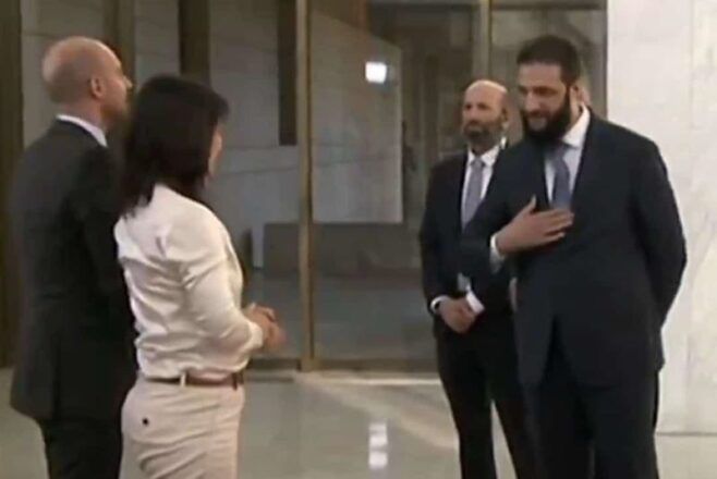Almanya Dışişleri Bakanı Annalena Baerbock, Fransız mevkidaşı Jean-Noel Barrot ile birlikte 3 Ocak’ta cihadist çetelere teslim edilen Suriye’yi ziyaret etti. Onları Şam’da cihadist çete Heyet Tahrir el-Şam (HTŞ) lideri Ebu Muhammed Colani karşıladı. Almanya Dışişleri Bakanı Baerbock spor tarzda giyinmiş, serbest tavırlar sergilerken, HTŞ’nin kadın erkek eşitliğini kabul etmeyen başkanı karşılamada Fransız Dışişleri Bakanı ile tokalaştı ancak onunla tokalaşmadı. Görüşme sona erdiğinde Fransa Dışişleri Bakanı Alman mevkidaşına elini uzatmadığı için Colani ile tokalaşmadan ayrılmış.